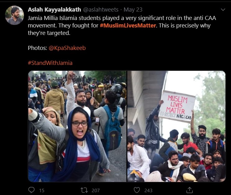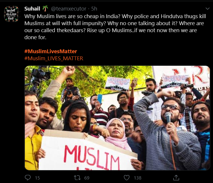 He is not the only one making such calls. Numerous accounts on social media are calling upon Muslims to ‘rise up’ because ‘if we not now then we are done for’. The hashtags #MuslimLivesMatter and #Muslim_LIVES_MATTER are being trended on twitter, drawing a false equivalence between Muslims in India and African Americans in the USA.