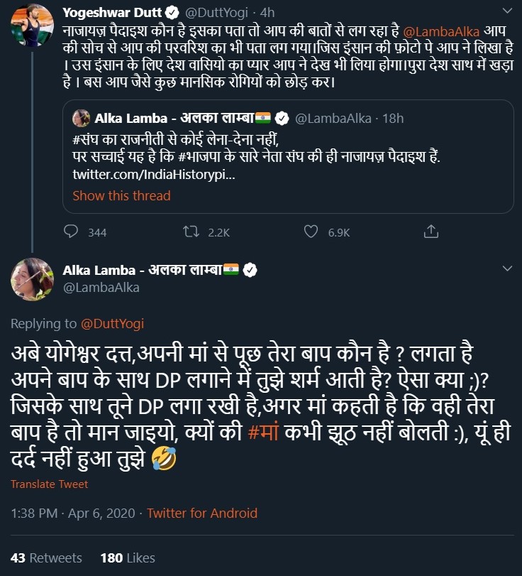 Recently, she went on a deranged rant against Olympic medallist Yogeshwar Dutt, when her foul words against the RSS were called out by the wrestler-turned BJP leader, Lamba has resorted to using foul, crass words about Dutt’s parents. Dutt had stated that he foul words only show Lamba’s own standard.