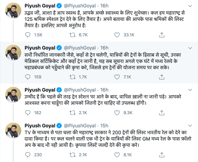 Later, the Railways minister again tweeted that despite waiting for 1.5 hours, the MH government has not sent any details to the GM. He added that train journeys have to be planned and the ministry does not want that after all the preparations and planning, the trains only idle on respective stations and are eventually cancelled as it had happened before.