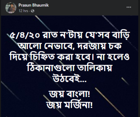 The post in Bengali loosely translates as, “Whoever will switch off their lights on April 5 at 9 pm, we will mark their houses with chalk. Even if this is not done, all such addresses will be listed.” He ends his veiled threats with “Jai Bangla (Hail Bengal).”