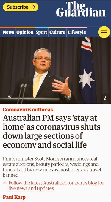 The Guardian also published a report on the 24th of March regarding the Australian Prime Minister’s ordered a shutdown of large sections of the country’s economy and social life as he urged his citizens to ‘stay at home’. The report said, “With hundreds of thousands facing unemployment, the federal government has suspended mutual obligations to apply for jobs to obtain jobseeker payments for one week, with further measures to protect renters now expected to be decided on Wednesday not Tuesday, as planned.”