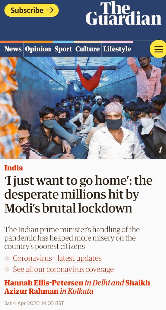 On the 4th of April, The Guardian published a report titled “‘I just want to go home’: the desperate millions hit by Modi’s brutal lockdown”. The report said, “The consequences for India, where tens of millions live in poverty, work thousands of miles from home, often living where they work, have been cataclysmic.” While it is true that the lockdown has affected the livelihood of a great many, most prominently the migrant labourers, there is no other way to combat the Wuhan Coronavirus crisis. Lots of other countries have gone into lockdown as well in order to combat the pandemic. Therefore, such proclamations regarding the actions of the Indian Government appear undue as it did not have too many choices to choose from.