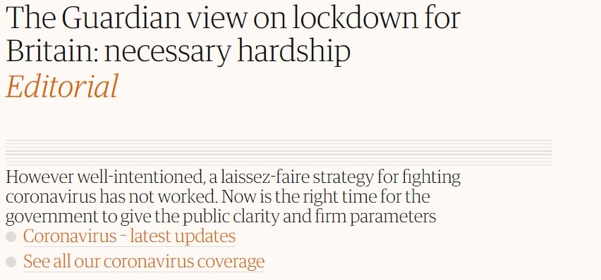 The editorial stated further, “It was imperative that Boris Johnson abandoned the register of exhortation and issued clear instructions that will be enforced, thereby instituting a lockdown. A laissez-faire approach to fighting a pandemic did not work.”