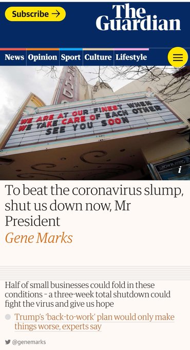Amusingly enough, on the 25th of March, The Guardian published an opinion piece addressing US President Donald Trump with the headline, “To beat the coronavirus slump, shut us down now, Mr President”. The author argued, “The economic situation, in my opinion, will only get worse the longer the pandemic is allowed to progress. Most small businesses will not be able to make it to the summer. Even if they’re allowed to reopen, without the public being confident that the virus has been fully contained and that a treatment is either available or on the way, consumers and diners will stay away. “Self-quarantines” and localized shutdowns aren’t going to work fast enough. So what’s the answer? A full shutdown in the US. For three full weeks.”