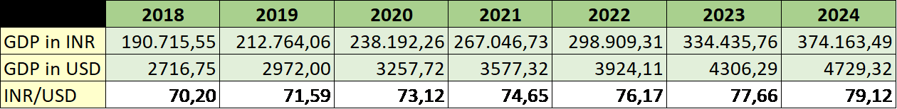The size of the economy in 2024 could exceed $4.7 trillion, if the GDP growth rate picks up or if Rupee stays stronger than the above estimates. For example, if real GDP grows at 7.6% per year, but the currency exchange rate in 2024 stays at the levels of INR 75 per USD then nominal GDP would hit $4.9 trillion in US dollar terms.