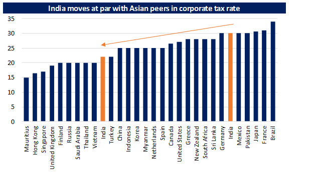 Structural reforms like IBC, GST and others have helped India jump World Bank’s Ease of Doing Business rankings from 142 (in 2014) to 63 (in 2019). That’s a quantum jump signifying a marked improvement in starting new businesses in the country. In another favourable policy change, the government has slashed corporate tax rates from 30% to 22% for existing companies and from 25% to 15% for new manufacturing companies. Including a surcharge and cess, the effective tax rate for existing companies would now come down from 35% to 25.17%. This makes India a highly attractive investment destination for companies looking to set up manufacturing.