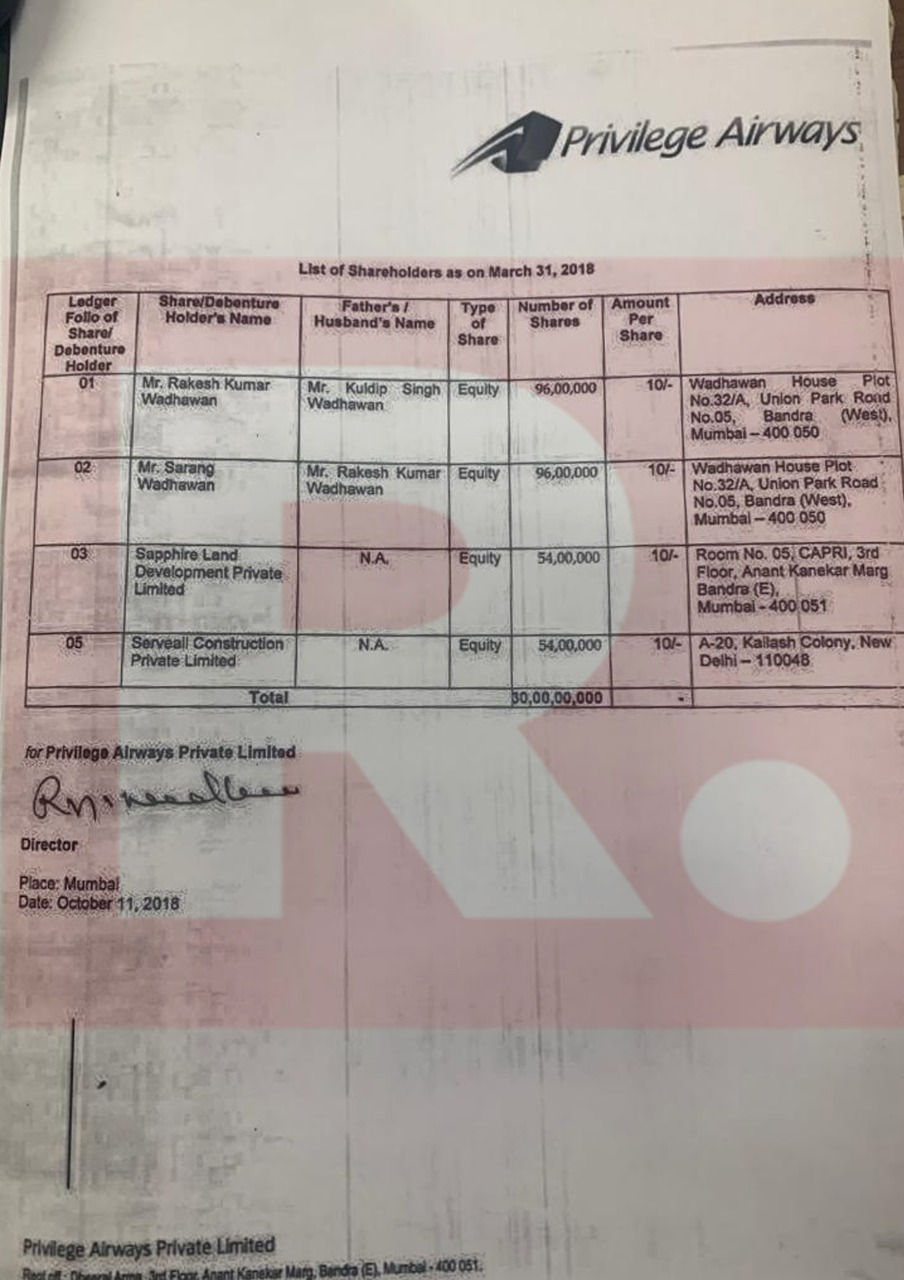 A series of documents reveals that the shareholding details of Wadhawans in a company named Privilege Airways.