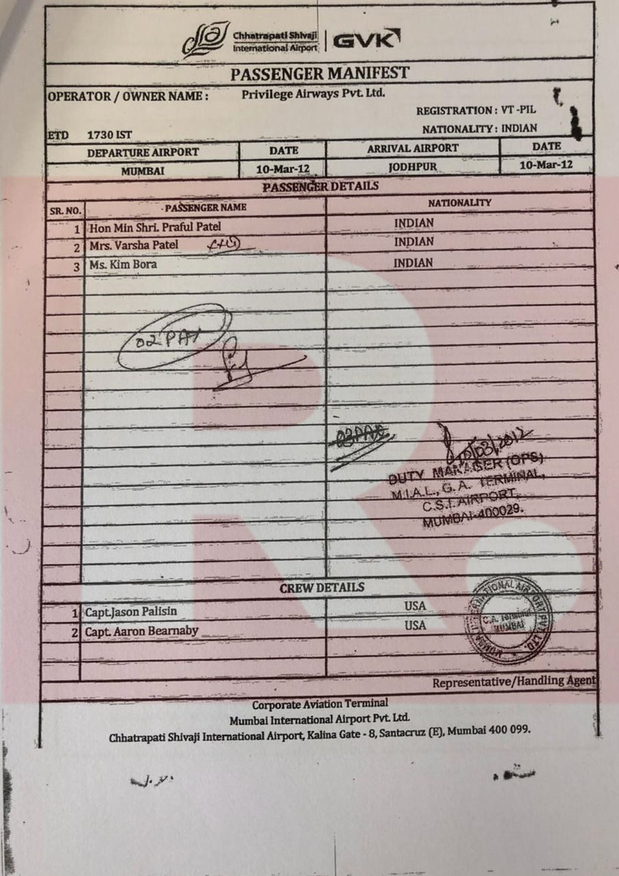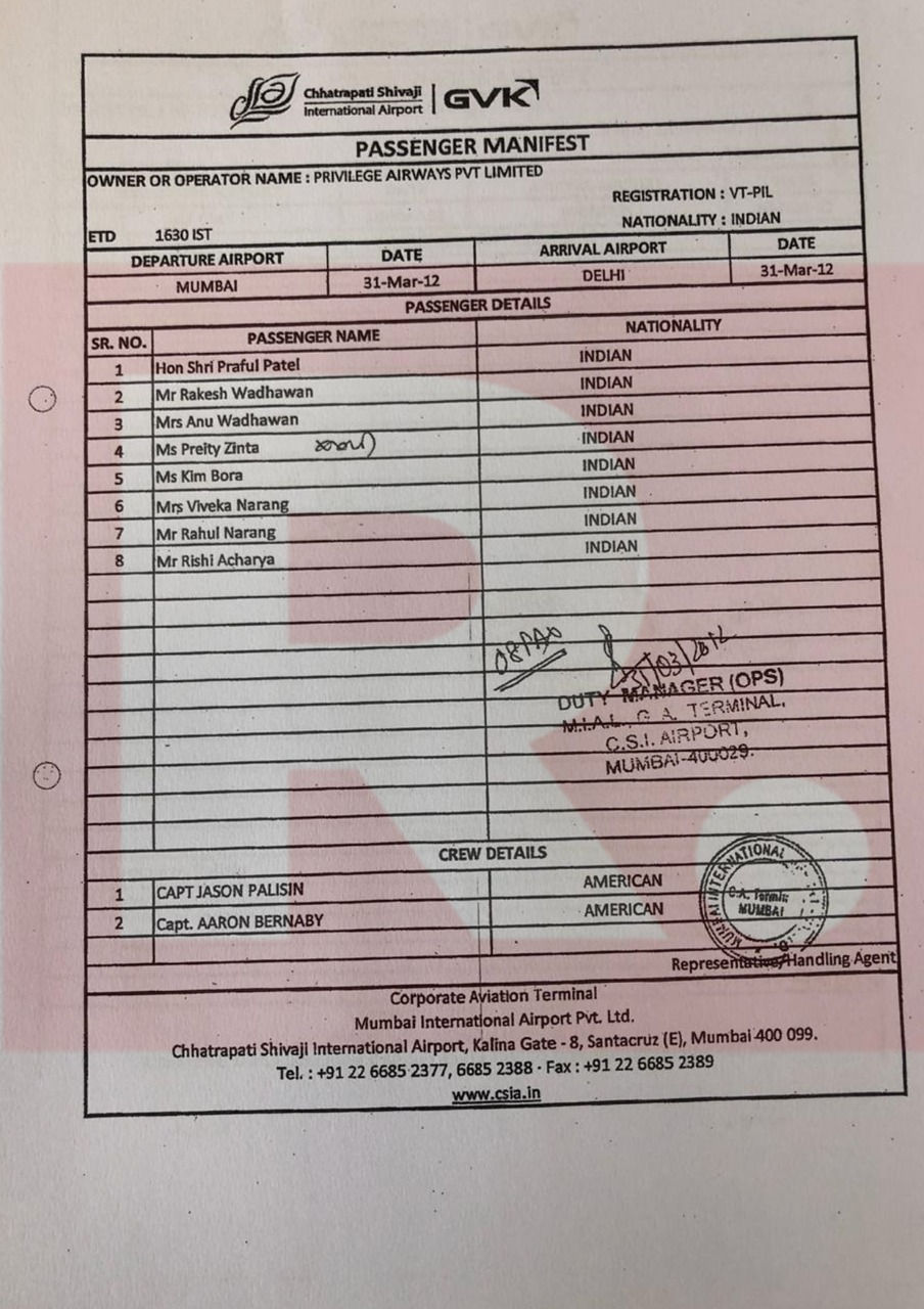 The second document dated 10th March 2012, shows Praful Patel who was the then Civil Aviation Minister as a passenger in the same airline. Another document dated 31st March 2012, shows Praful Patel’s name again in the passenger manifest along with Rakesh Wadhawan among others. Several other documents show that Praful Patel has used the Wadhawans’ private jet a total number of 8 times during the time period of February 2012 to May 2012.