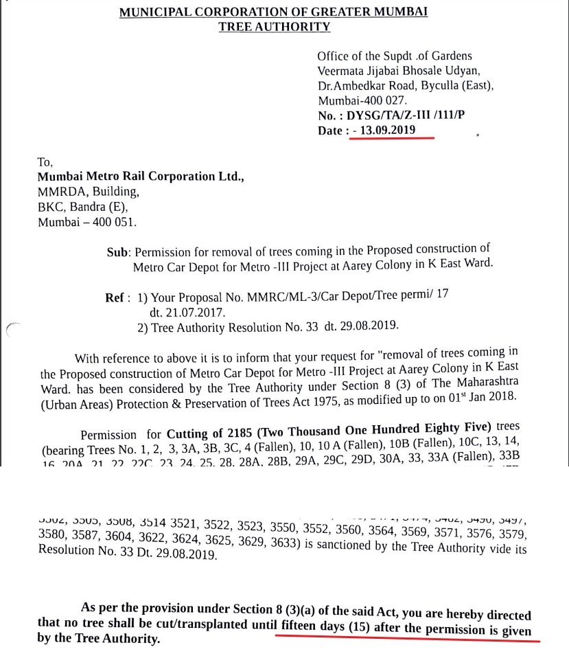 This clearly means that the Tree Authority had decided to allow cutting and transplanting of trees on 29th August, and it had issued the order to the Mumbai Metro Rail Corporation Ltd on 13th September. Therefore, the waiting period of 15 days is already over on 29th September, as it starts from the day the order was issued, not when it was uploaded on the BMC website. As the High Court dismissed all petitions against the order, this means the Tree Authority order remains valid, along with its issue date and the waiting period. The date of uploading the same on the website is not relevant in this case, as claimed by the activists.