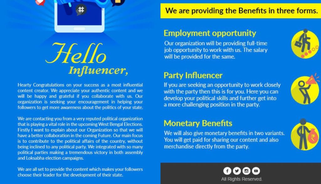While reaching out to influencers is normal for political lobbyists and agencies including for brand promotion, it is interesting that even a digital portal was approached for paid promotions. One certainly does wonder how much of the political content in the run-up to West Bengal Assembly elections would be paid for when in favour of Mamata Banerjee led TMC.