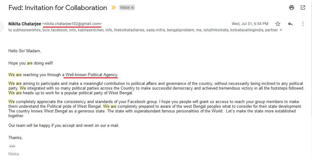 The report on Darjeeling Chronicle says the content of his email is similar to what Nikita had sent, only this time it was sent in poster form, and this time around there is specific mention that they are going to PAY for their contents to be shared through our platform.