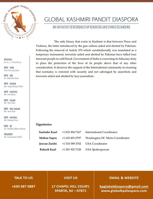 They further assert, “The reports that have emerged from Kashmir since the blackout are frightening. Thousands of Kashmiris, including human rights advocates, elected officials and even young students, have reportedly been arrested in raids. The local prisons are full, according to a local magistrate, and many detainees have been flown out of the region. Family members wait in anguish, fearing that their loved ones may be forcibly disappeared, as an estimated 8,000 Kashmiris were before them. There have been reports of torture and police violence. Compounding this is a humanitarian crisis, as patients in Kashmir can’t access medicine and life-saving treatment.”