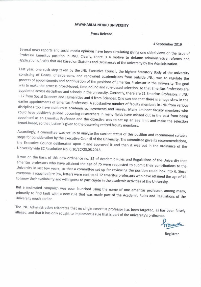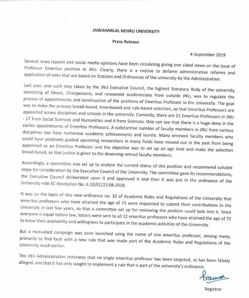 JNU says that a motivated campaign was launched using the name of one Emeritus Professor, while the same letter has been sent to 12 such persons. It adds that no single emeritus professor has been targeted as alleged in media reports, and the University is only implementing a rule of the University.