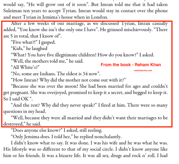 Khan’s ex-wife shares some interesting features of this Nobel Peace Prize contender. Reham Khan writes that Imran Khan informed her of total 5 of his illegitimate children including Tyrian White. It’s interesting to see him boasting about some Indian illegitimate children of his, eldest being 34 years of age and how he ‘helped’ some Indian women get pregnant when their husbands failed to do so! This is a typical Pakistani mindset that considers victory in ‘winning’ women of others that forms the basis for rape, forced conversion, Nikah and disappearances of thousands of Hindu girls every year in Sindh and across Pakistan. And yes, this is the continuation of same rape tradition from Muhammad Bin Qasim to Ghazni to Ghori to Mughals that Pakistanis hail as heroes.