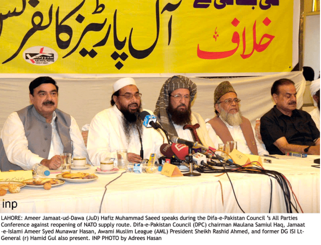 11. Imran Khan’s Minister for Inter-faith harmony Noor Ul Haq Qadri in a spiritual discussion with Hafiz Saeed (also joined by Moulana Sami Ul Haq – father of Taliban)