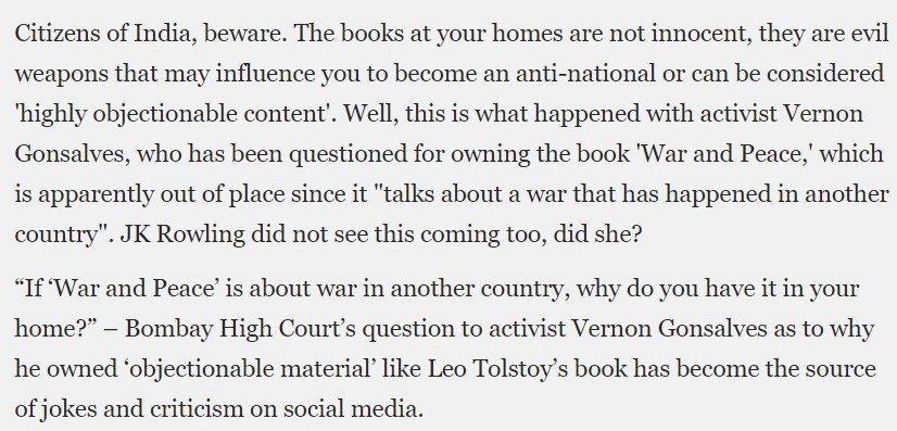 On Wednesday, a certain piece of news spread like wildfire. Numerous media outlets told Indians that a certain Bombay High Court judge had inquired Vernon Gonsalves, an ‘activist’ who had been arrested in connection with the ‘Urban Naxal’ case, why he had Leo Tolstoy’s literary classic, War and Peace, in his home.