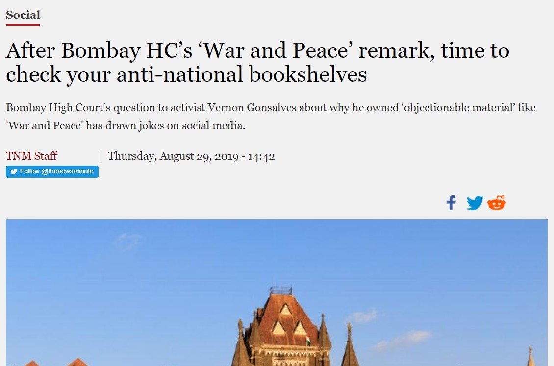 But the award for the most embarrassing statement on the matter, no doubt, goes to The News Minute. It published a report on the matter titled “After Bombay HC’s ‘War and Peace’ remark, time to check your anti-national bookshelves’. The report has since then been updated after recent developments.