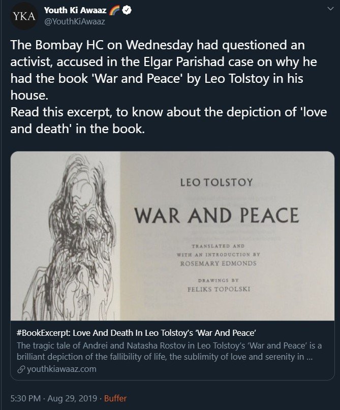 It seems recent developments haven’t yet reached the ears of ‘Youth ki Awaaz’, which is basically Far-Left Youth ki Awaaz. Long after it became common knowledge that the Bombay High Court judge wasn’t referring to Leo Tolstoy’s classic, this is what the media portal tweeted: