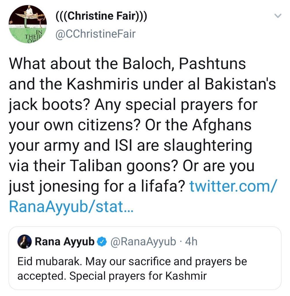 Rana had wished Eid Mubarak and put out special prayers for Kashmir. To that, Fair asked her why she is not putting out special prayers for Balochistan, Pashtun and the Kashmiris where Pakistan has illegally occupied Kashmir. She questioned Ayyub why no ‘special prayers’ for the Afghans being slaughtered by ‘your’ (presumably implying Pakistan Army) and ISI through their Taliban goons.