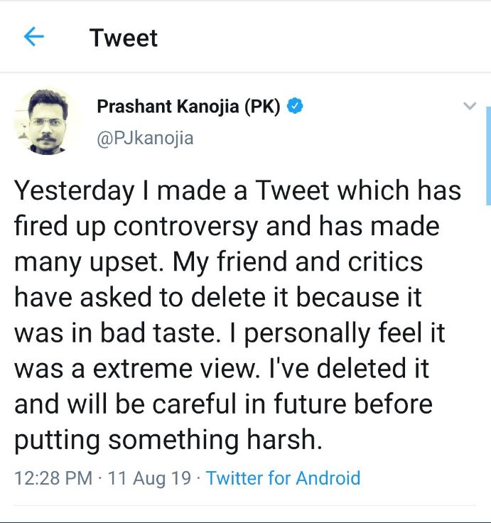 The Tweet was, however, pulled down by the journalist, who again took to Twitter to notify this. But somehow the explanation he gave for deleting the tweet, which was in bad taste, especially for a highly decorated Army chief, could not be exactly categorised as an apology.