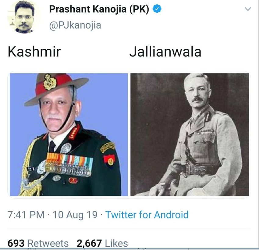 By Tweeting an image of General Bipin Rawat beside General Dyer, captioning it as Kashmir and Jallianwala respectively, Kanojia not only attempted to insinuate that General Rawat’s role in Kashmir is similar to that of Dyer, who had ordered the massacre in Jallianwala Bagh on April 13, 1919, when hundreds of civilians were killed including women and children, but also once again exhibited his mediocre mindset.