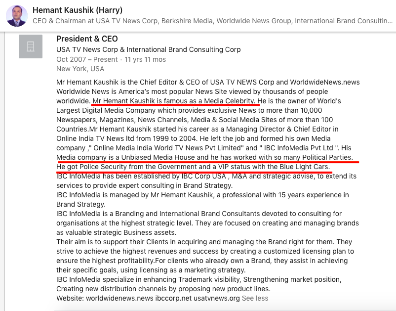 On the professional networking site LinkedIn, we saw Hemant Kaushik writes a testimonial for himself.