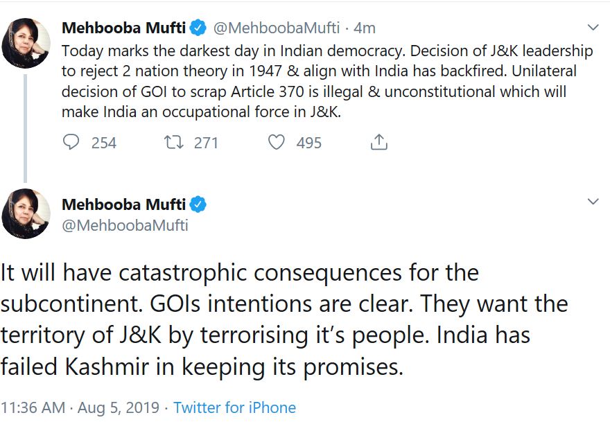 — Mehbooba Mufti (@MehboobaMufti) August 5, 2019