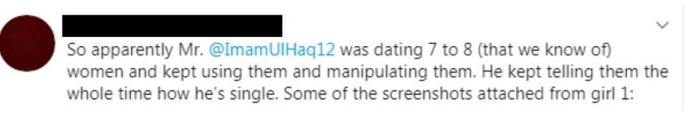“So apparently Mr. @ImamUlHaq12 was dating 7 to 8 (that we know of) women and kept using them and manipulating them. He kept telling them the whole time how he’s single. Some of the screenshots attached from girl 1,” a Twitter user wrote attaching screenshots of the cricketer’s alleged chat.