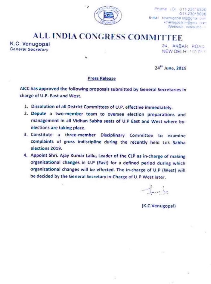AICC has vested powers with Ajay Kumar Lallu, the leader of CLP, to make organisational changes in East Uttar Pradesh for a specified period during which changes will be carried out. The in-charge of West Uttar Pradesh is to be decided later by Jyotiraditya Scindia, the General Secretary in-charge of West Uttar Pradesh. It may be noted that Priyanka Gandhi Vadra is the General Secretary for UP East.