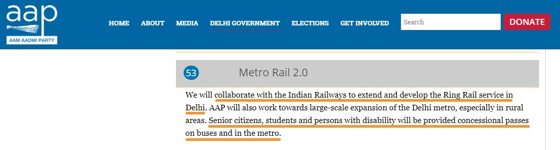 AAP 2015 Manifesto promising free rides to senior citizens, disabled and students/ Action plan no. 70 – Metro Rail 2.0