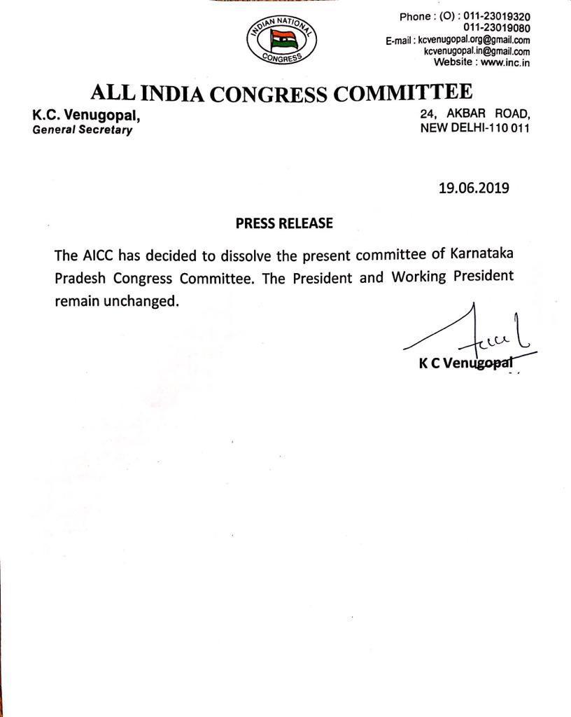 The All India Congress Committee has decided to dissolve the Karnataka Pradesh Congress Committee. A brief statement issued by the AICC said that the present committee of the PCC has been dissolved. But the President and the Working President of Karnataka Congress remain unchanged.