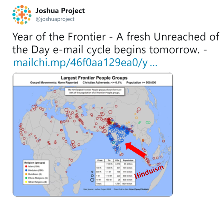 “Joshua Project”, an organization based in the United States maintains ethnological data to support Christian missions. It highlights the ethnic groups of the “unreached” world or the areas with the least followers of evangelical Christianity.