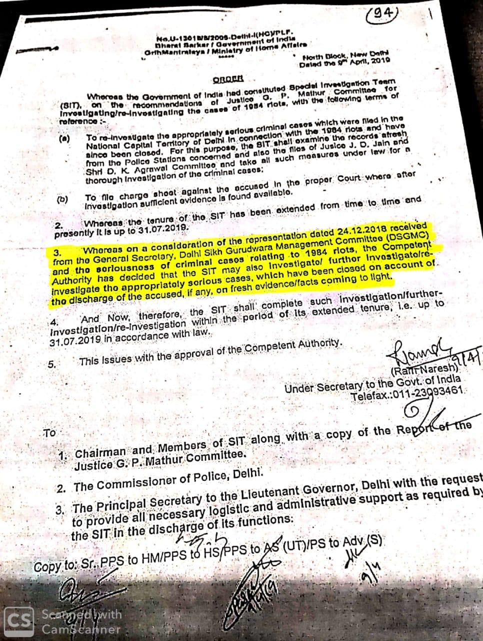 The order that Sirsa was referring to is dated April 9th 2019. The order says that the SIT should reinvestigate serious criminal cases which were filed in the National Capital Territory of Delhi in connection with the 1984 riots case and have since been closed. For this purpose, the SIT shall examine the records afresh.