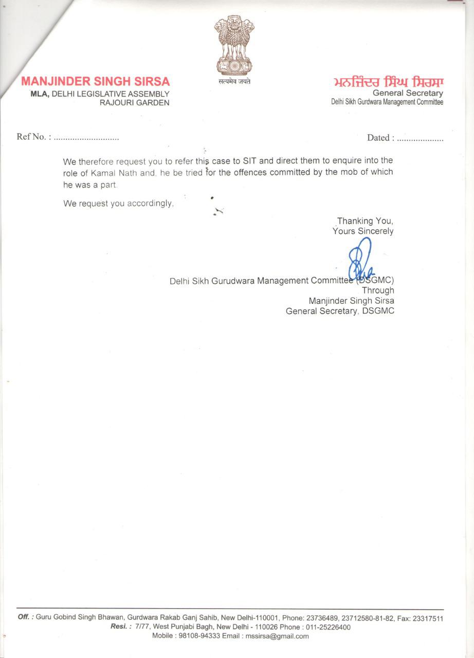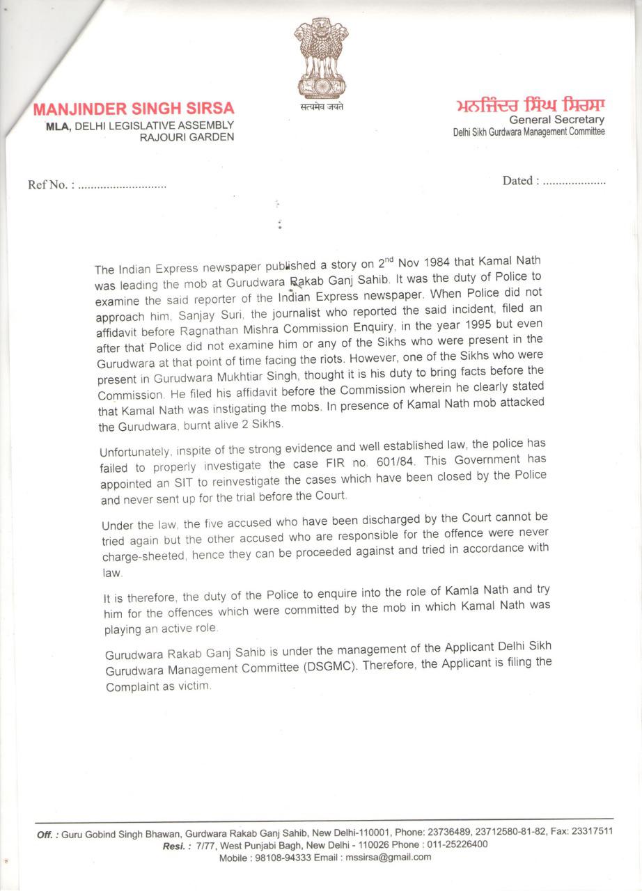 The representation that the order refers to was made by MS Sirsa. The representation spoke about the attack on Rakab Ganj Gurudwara in which Kamal Nath is said to have led the mob.