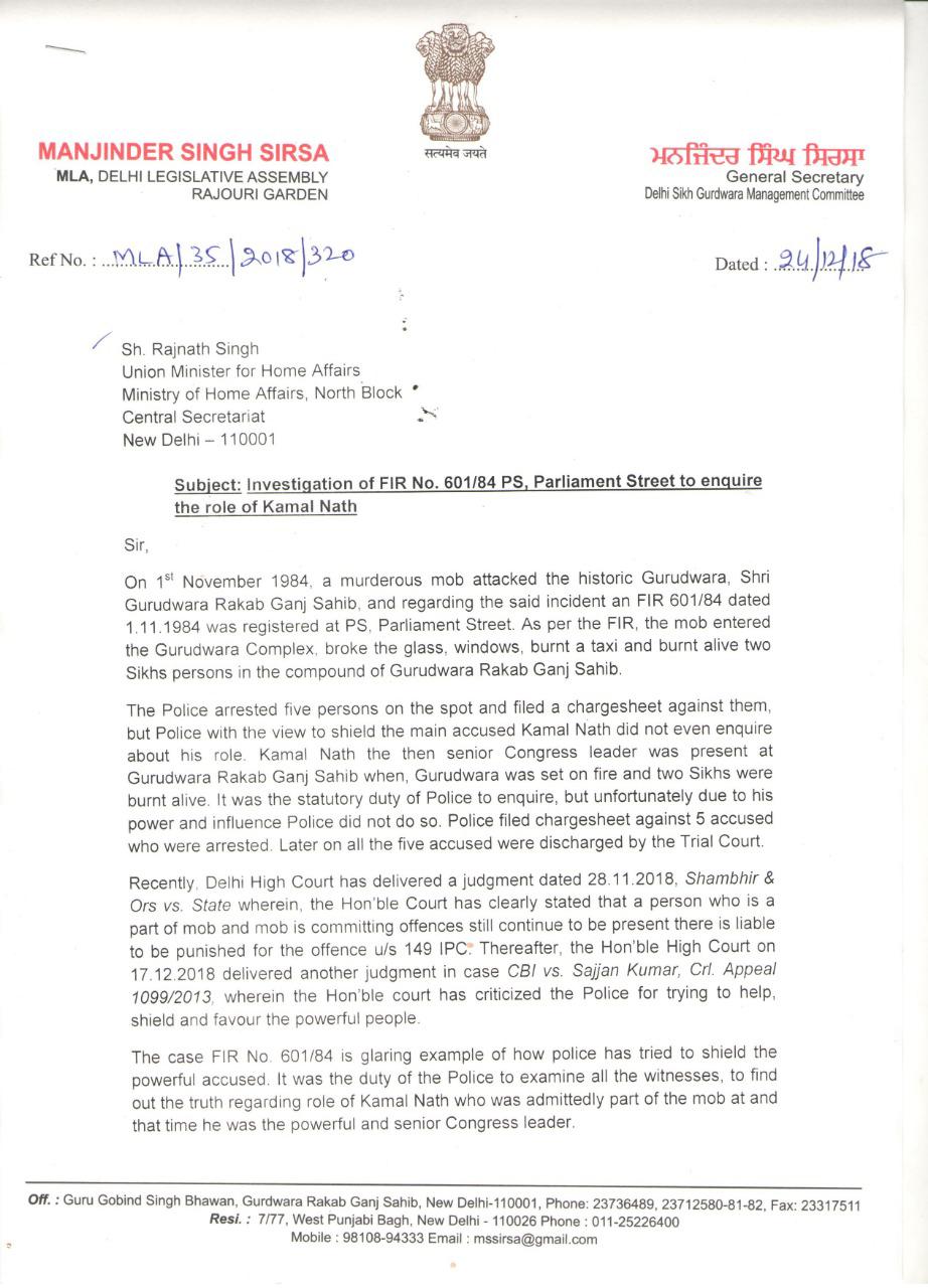 In his representation, Sirsa had said that there was clear evidence that Kamal Nath was present at the Rakab Ganj Gurudwara inciting the mob in 1984 but unfortunately the police had failed to investigate the case properly. Sirsa had said that the five people who were discharged for the crime cannot be tried in the court of law, but the real culprit was never chargesheeted and thus, it is the duty of the police and the SIT to proceed against these culprits and bring them to book.