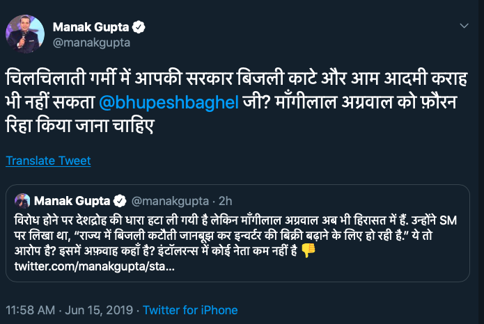 Journalist Manak Gupta had shared a Tweet, where he had stated that after widespread outrage, the sedition charges against Agarwal have been dropped but Agarwal’s post is an allegation, not a rumour. Sharing another tweet, he had stated that when the people of Chhattisgarh are suffering due to the frequent power cuts, the government is arresting people for even complaining about it. Gupta had demanded Agarwal’s immediate release.