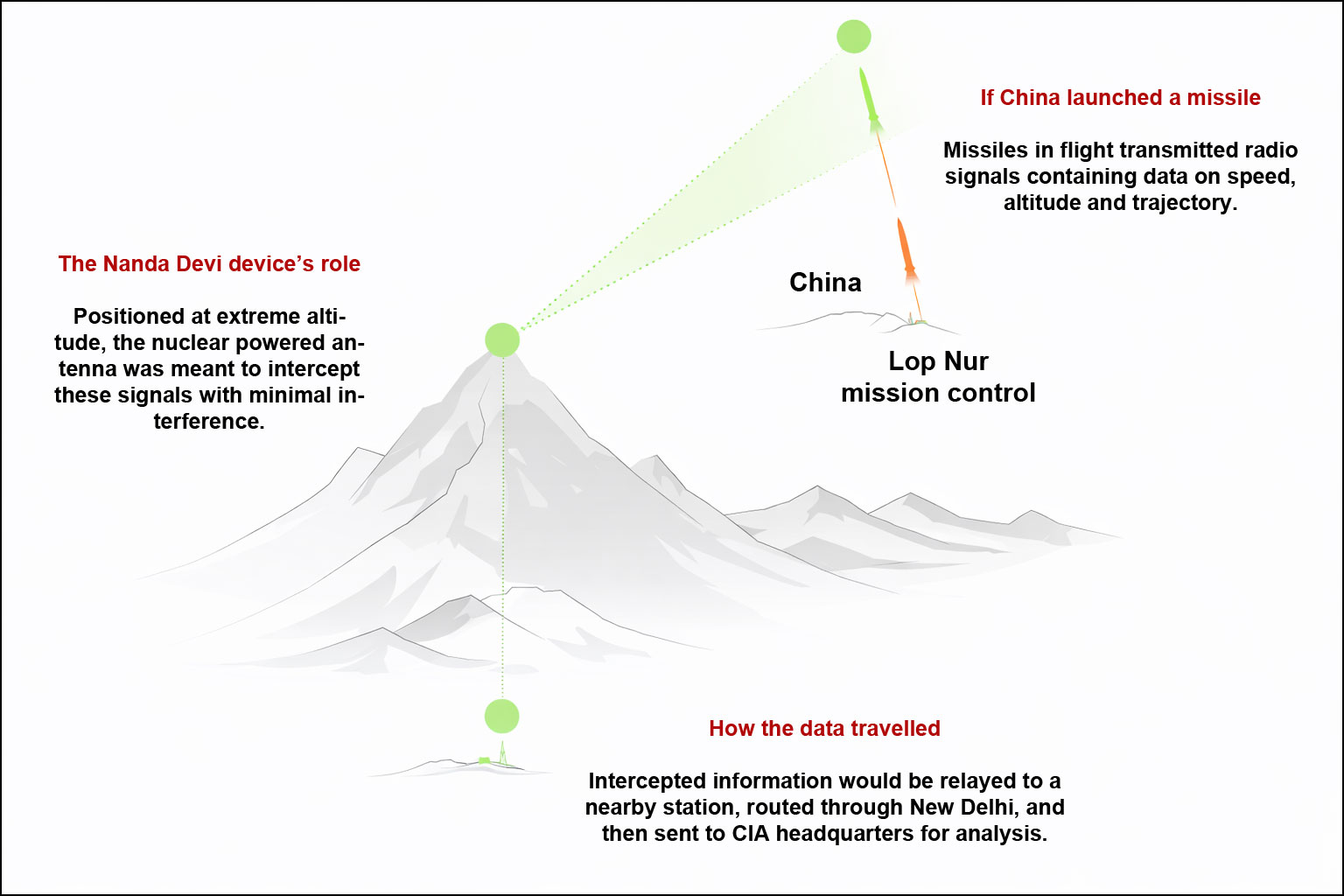 Reportedly, the CIA proposed installing a remote listening station high in the Himalayas to intercept radio signals and telemetry data from Chinese missile tests conducted in Xinjiang. The extreme altitude was chosen to overcome line-of-sight limitations and atmospheric interference.