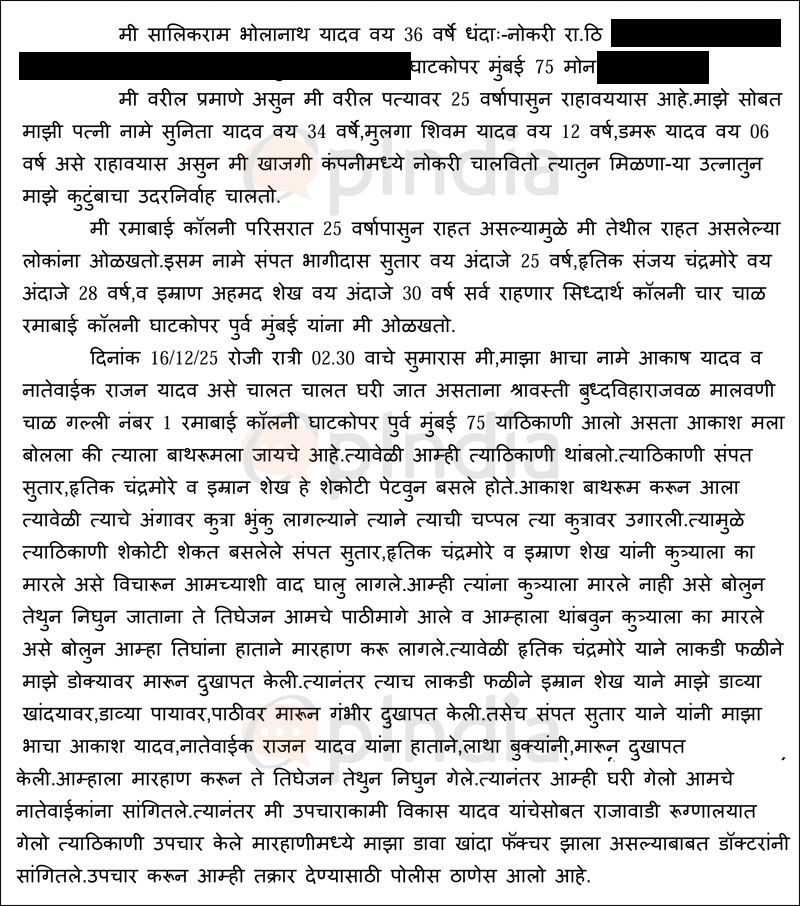 On 16th December, a late-night walk home in Mumbai’s Ghatkopar turned violent after a man and his relatives were assaulted for merely shooing away a barking stray dog. The victim, identified as Salikram Bholanath Yadav, suffered a fractured shoulder and head injuries requiring stitches following an attack by three local men in the Pantnagar police station limits. OpIndia has accessed the FIR registered in the matter.