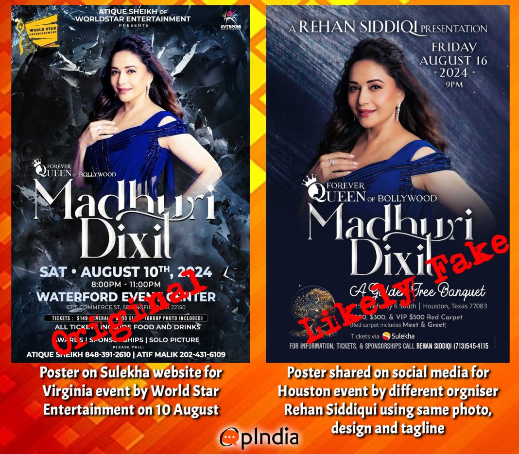 The poster being shared uses the tagline Forever Queen of Bollywood Madhuri Dixit in the same design and typeface as the posters for the real tour of Dixit. A cursory glance shows that this poster has been created using the poster for the Virginia concert on 10 August. Madhuri Dixit’s photo along with the tagline has been retained, while the background and other text have been changed.