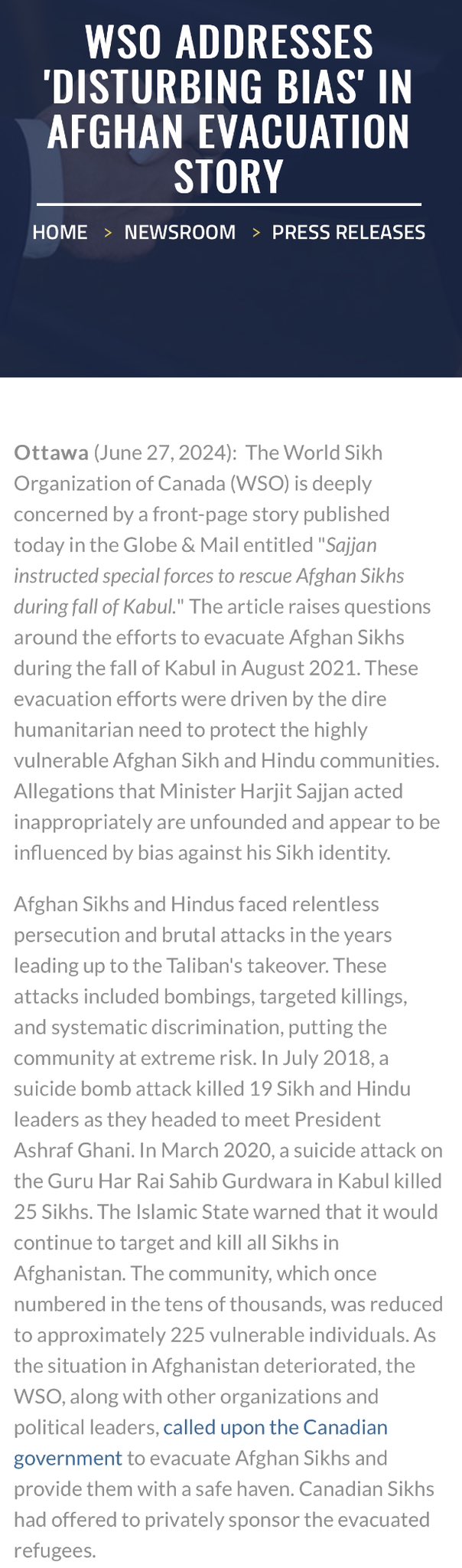 Amidst the controversy, the World Sikh Organisation has come to Harjit Sajjan’s defence alleging that The Globe’s report is influenced by a “bias” against the Sikh community. “These evacuation efforts were driven by the dire humanitarian need to protect the highly vulnerable Afghan Sikh and Hindu communities. Allegations that Minister Harjit Sajjan acted inappropriately are unfounded and appear to be influenced by bias against his Sikh identity,” the WSO statement reads. Notably, Harjit Sajjan’s father, Kundan Sajjan, was an executive board member of the WSO.