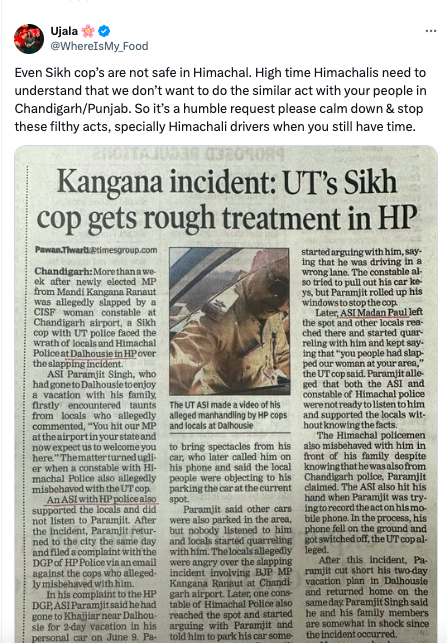 Several X users used the TOI report on the incident to peddle a false and sinister narrative against the Himachali people. One X user “Ujala” wrote, “Even Sikh cop’s are not safe in Himachal. High time Himachalis need to understand that we don’t want to do the similar act with your people in Chandigarh/Punjab. So it’s a humble request please calm down & stop these filthy acts, specially Himachali drivers when you still have time.”