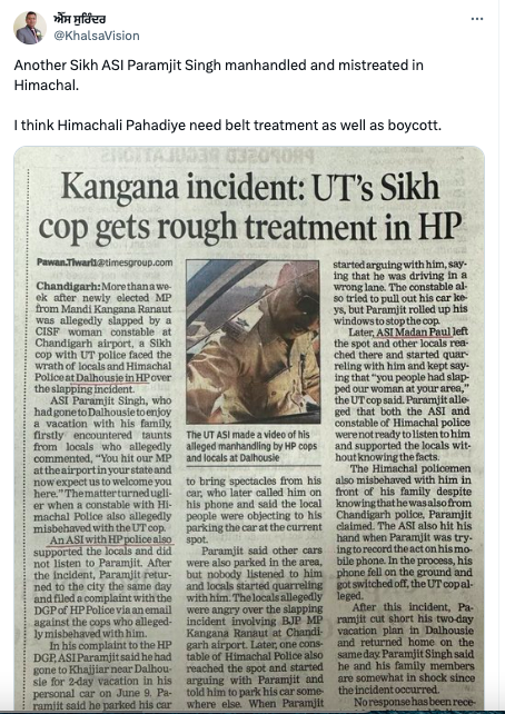 In a recent incident,it was reported that a Sikh Police officer from Chandigarh ASI Paramjit Singh was manhandled by locals in Dalhousie and Himachal Police over Kangana Ranaut slapping incident. A report by Times of India on 17th June claimed that some locals taunted ASI Singh saying “You hit our MP at the airport and then expect us to welcome you here.”