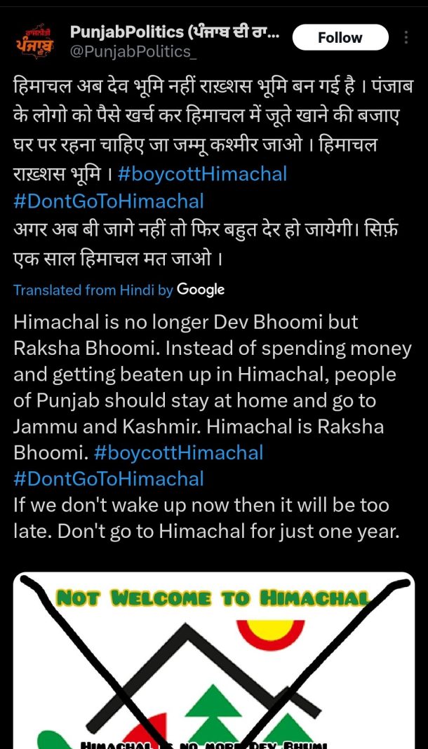 Meanwhile, one “Punjab Politics” urged the Punjabis to boycott Himachal Pradesh and go to Jammu and Kashmir instead since Himachal Pradesh has become “Rakshasa Bhoomi” [Demon’s land]. “Himachal is no longer Dev Bhoomi but has become Rakshasa Bhoomi. Instead of spending money and getting beaten up in Himachal, people of Punjab should either stay at home or go to Jammu and Kashmir…Don’t go to Himachal for just one year,” the X user wrote.