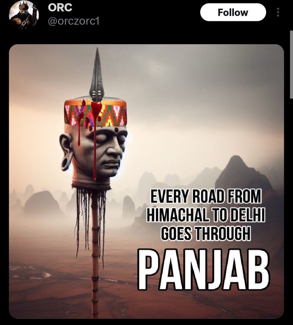 One X user “ORC” went on to incite violence and shared a violent image suggesting the beheading of Himachal Pradesh locals. The X user shared an AI-generated image showing the severed head of a man wearing a Himachali (Pahadi) cap impaled on the tip of a spear. The image also contained text overtly threatening the Himachalis of violence and said, “Every road from Himachal to Delhi goes from Panjab.”