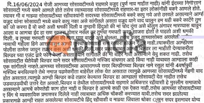 The complaint filed to the Police mentioned that there’s always a ruckus happening in the society due to other Muslims coming to the society to offer Namaz in the illegal Masjid built here. “The builder doesn’t listen to us as the majority of the families living here are Muslims. There is no societal rule, and there is no mutual respect here. Hindus are just harassed every other day. We want police to look into the matter,” the complaint read.