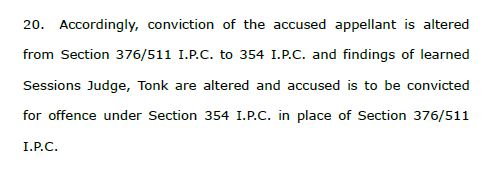 The court modified Sections 376/511 under which the trial court had convicted him and changed it to Section 354. For this, the court relied upon the case of Sittu v State of Rajasthan. In that case, the girl was forcibly made naked and the accused attempted to penetrate her despite her resistance. The court noted that the said acts by the accused were seen as crossing the stage of preparation and amounted to attempting to commit rape.