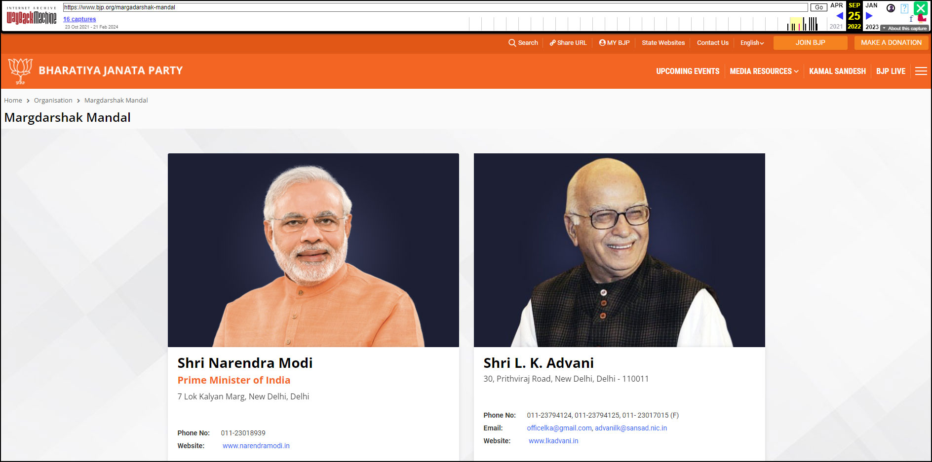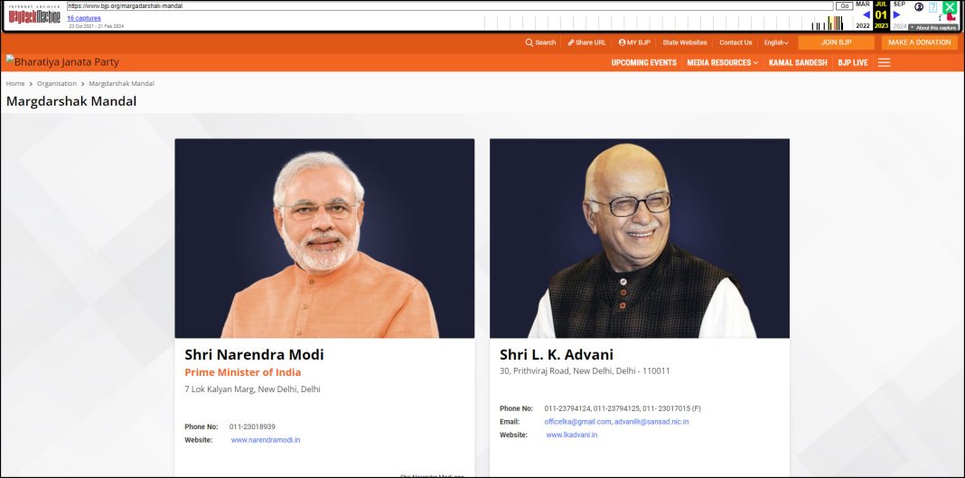 Furthermore, we also found archives of the page from 2022 and 2023 where both PM Modi and Rajnath Singh were part of Margdarshak Mandal.