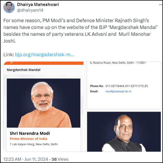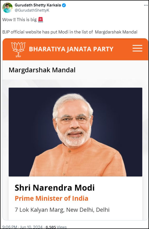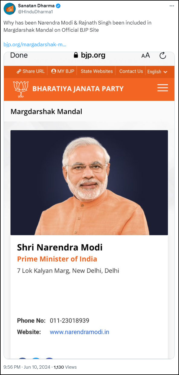 On 10th June, a message on WhatsApp and social media started to circulate that Prime Minister Narendra Modi has been added to Bharatiya Janata Party’s “Margdarshak Mandal”. The assertion has been made that he was added to the “Mandal” alongside veteran BJP leaders like LK Advani and Murli Manohar Joshi as “punishment” for unfavourable results in Lok Sabha Elections 2024.