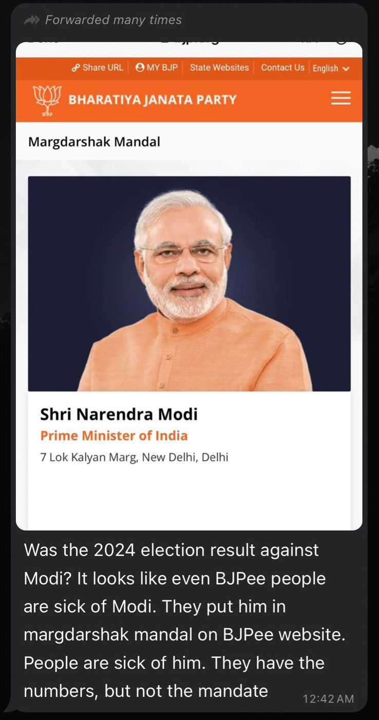 The WhatsApp message had a screenshot of the BJP’s website’s “Margdarshak Mandal” page alongside text that read, “Was the 2024 election result against Modi? It looks like even BJPee people are sick of Modi. They put him in Margdarshak Mandal on the BJPee website. People are sick of him. they have the numbers, but not the mandate.”