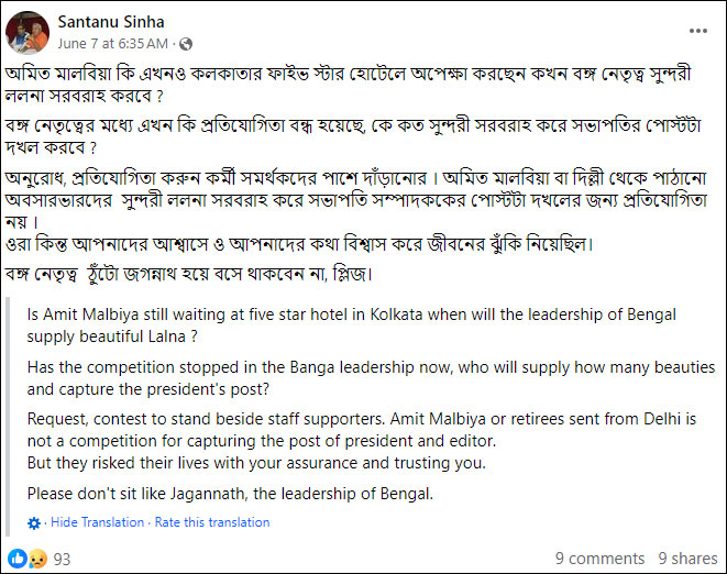 Despite the legal notice, Santanu Sinha has not removed the post from Facebook. In the post in Bengali, Santanu accused Amit Malviya and other senior leadership of BJP of accepting sexual favours from leaders in West Bengal and in exchange providing them positions in the party. He accused West Bengal BJP leaders of sending women to Malviya and other senior leaders of BJP women in 5-star hotels to secure president’s posts. He wrote, “Is Amit Malviya still waiting in a five-star hotel in Kolkata for the Bengal leadership to provide beautiful women? Has the competition among the Bengal leadership stopped over who can provide the most beautiful women to secure the president’s post? Please, compete in standing by your workers and supporters. Not in providing beautiful women to Amit Malviya or the observers sent from Delhi to secure the president or secretary posts. They, after all, took risks in their lives based on your assurances and your words. Bengal leadership, please don’t sit idle like a mere figurehead.” (Translation from Bengali to English done using ChatGPT).